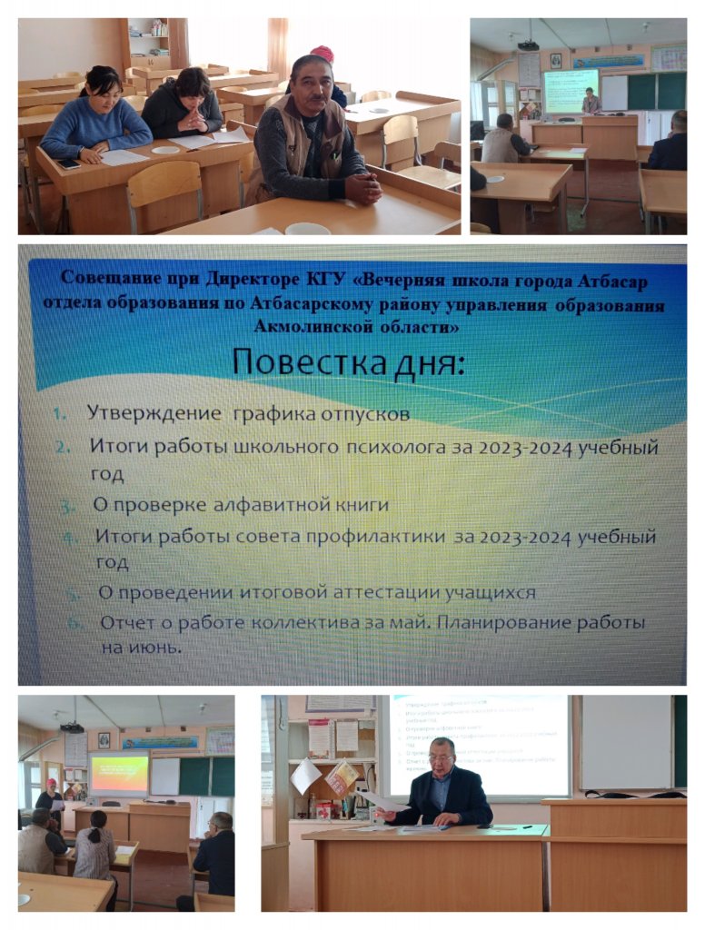 2024 жылғы 23 мамырда директормен кеңес өтті. Педагог-психолог, директордың тәрбие жөніндегі орынбасары, жаратылыстану-математикалық цикл әдістемелік бірлестігі басшысының сөздері тыңдалды.